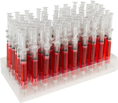 Pack of 60 syringe pens. Perfect for your store countertop or great for the house or science classroom. Fully functional pens with a great design to boot. All pens have blue ink. For writing purposes only - do not attempt to inject classmates/friends. By Allures & Illusions