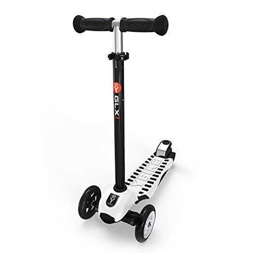 Meet the GLX Pro, the next generation of the award-winning YBIKE GLX scooter. With its modern 3 wheel 'Lean and Steer' design, the GLX PRO is the perfect scooter for the older and more skilled rider (ages 5 and up, 110 pound weight capacity). The adjustable handle bars extend from 28 inches above the deck to 32.5 inches, enabling the PRO to grow with your child. Larger 125 mm front wheels and a fiber reinforced non-slip ABS deck ensure a fast, smooth, thrilling ride. Specifications: Age: 5 to 10 years old. Weight: Maximum child weight of 110 lbs. Materials: aluminum, injected molded plastic body, rubber grips, composite wheel core with cartridge bearing, cast PU wheels. Rear wheel: 100 mm. Item Weight: 5.5 lbs. Item Dimensions: 22.4L x 11.4W x 32-36H inches.