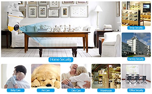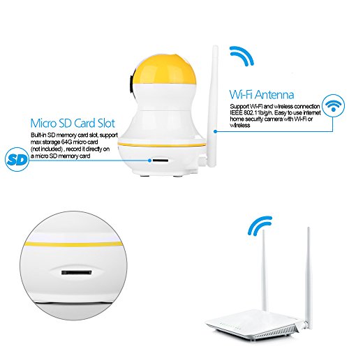 -. Feature : WIRELESS IP CAMERA - It not only support network connection via cable, also with Wi-Fi. Easy to use internet home security camera with Wi-FI or wireless. Wireless Standard: IEEE 802.11b/g/n, Wireless Security: WEP, WPA, WPA2. Supports maximum 64GB TF card for video and audio (Included 32GB TF Card in the package) / P2P(PLUG AND PLAY) - Peer to peer communication, no need DDNS, no need port-forwarding, with step by step instruction. It is supports QR code scanning, 3 steps easy setup with step by step instruction, without any complicated IP address, port mapping and DDNS settings. Easy and simple setup. / MUFTI-PLATFORM VIEW - Most of IP camera only can be controlled on the wed. This item is also support Tablet (iPad, Android tablet), Smartphone (iOS, Android) to surveillance and control from anywhere anytime. Keep an eye on your loves and belongs anytime and anywhere. Operation System: iOS 6.0 and above, Android 4.2 and above, Windows XP and above. / TWO WAY AUDIO - Built-in speaker and microphone. Not only can you see what is happening in front of your camera, also you can hear and speaker. Be capable of delivering high-quality HD imagery in 720P (1280x720), allows you to record more details and cover more space. / NIGHT VISION AND MOTION DETECTION - Night Vision (up to 8 meters) via auto IR-LED illumination, Infrared Motion Detection (with email notification). Even if the room you're watching is completely dark, you'll see a clear picture thanks to that camera's infrared night vision, provided security even in darkness.