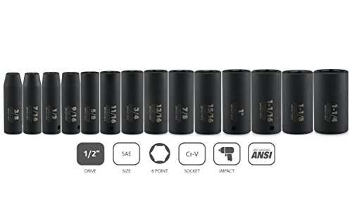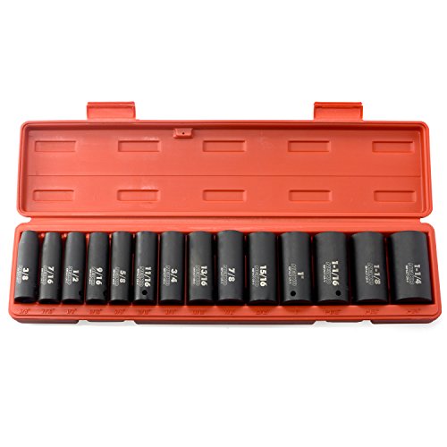 - 14 Pieces deep broach standard sockets come in a heavy duty custom case with size index for easy storage: 3/8, 7/16, 1/2, 9/16, 5/8, 11/16, 3/4, 13/16, 7/8, 15/16, 1, 1-1/16, 1-1/8, 1-1/4 inch