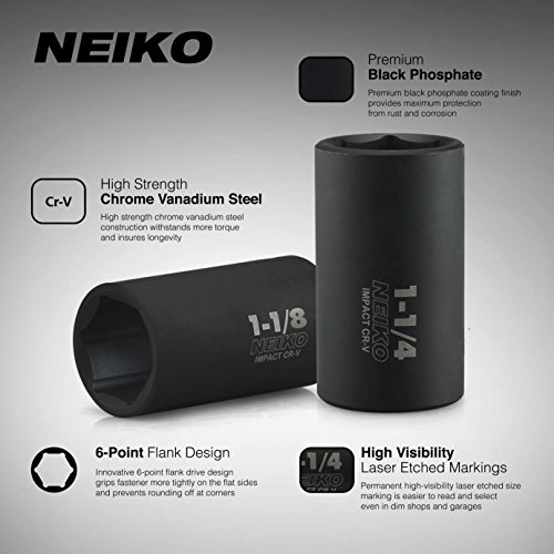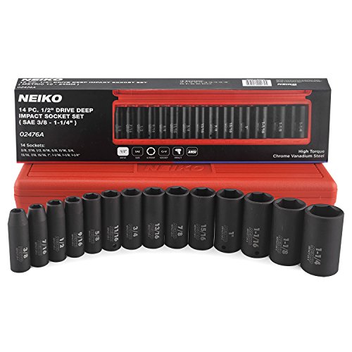 Neiko 02476A 1/2” Drive Deep Impact Socket Set, Cr-V Steel, 6-Point | 14-Piece Set | SAE 3/8 To 1-1/4”