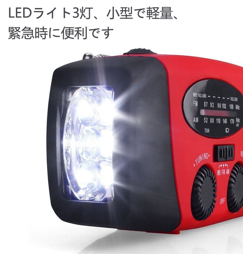 With manual power generation, photovoltaic generation, it is possible to use lights and radios even in an emergency without power supply.