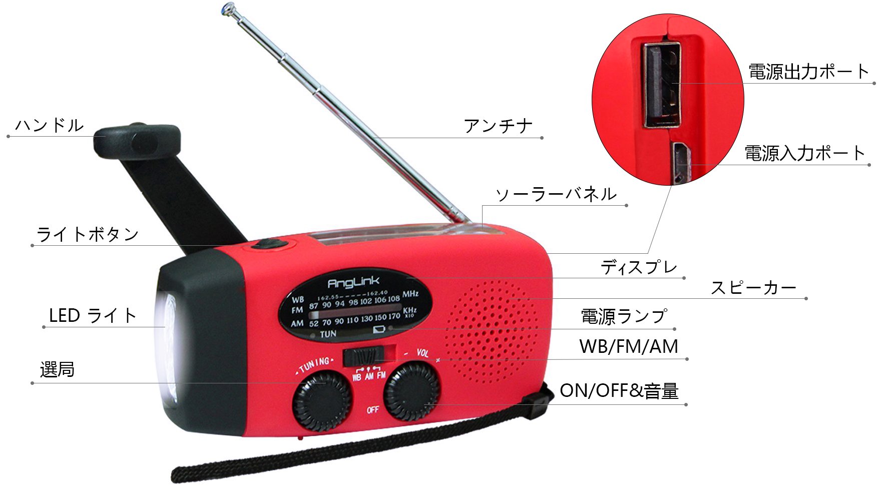 2, hand-cranked charge ~ You can charge by turning the handle on the back of the main unit.