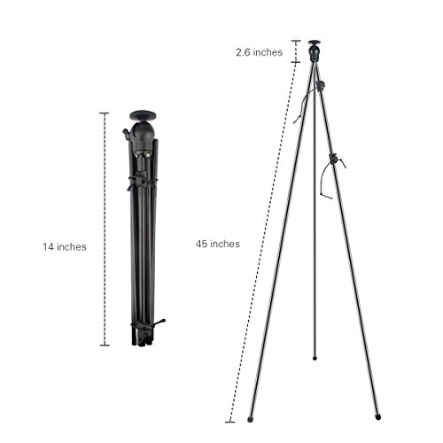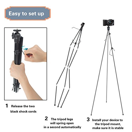 ✔Hand Free Setup instantly: It is quiet easy and convenient to setup the tripod. Just release the two black shock cords and the legs of the tripod will spring open in seconds to a height of 45 inch tall.