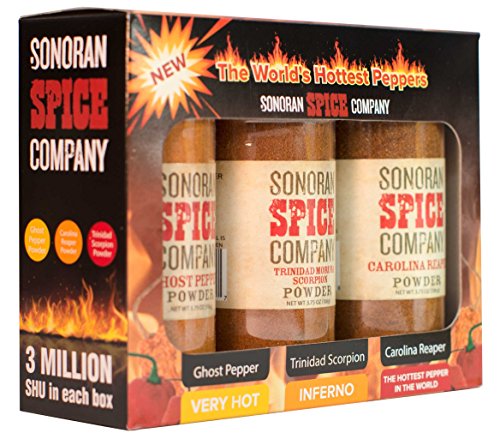 -. Binding : Misc. -. Brand : Sonoran Spice -. Color : red -. EAN : 0855805005558 -. Feature : Gift box includes 3 of the world's hottest peppers! / Carolina Reaper is the current world's hottest pepper. / Gluten Free, 100% pure, no additives. / Each jar has a tamper proof seal with a sifter flip cap. / All of the powders are non-smoked and come in a beautiful gift box. -. Label : Sonoran Spice -. Manufacturer : Sonoran Spice -. NumberOfItems : 1 -. PackageQuantity : 1 -. ProductGroup : Grocery -. ProductTypeName : GROCERY -. Publisher : Sonoran Spice -. Size : 3.75 Oz -. Studio : Sonoran Spice -. Title : Sonoran Spice Carolina Reaper, Trinidad Scorpion, Ghost Pepper 3.75 Oz Powder Gift Box -. UPC : 855805005558