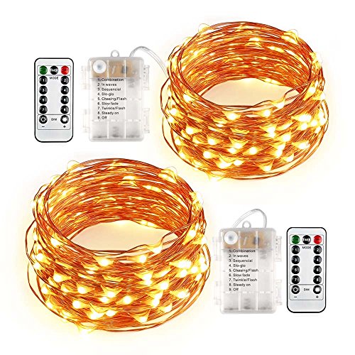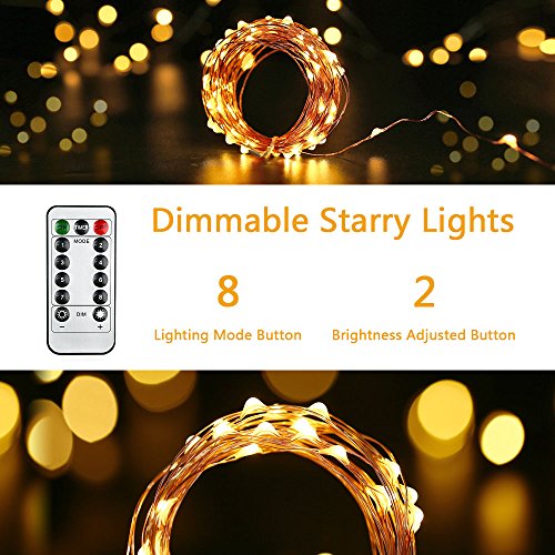 Dimmable LED String Lights: Remote control, just push a button to turn it On/Off, set the time(6 hours ”on” and 18 hours “off”), adjust brightness or select favorite modes between 8 lighting modes