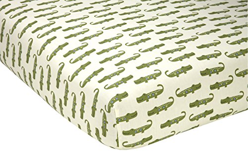 -. Feature : 4pc crib set fits a standard size crib mattress 28" x 52". Appliqued Comforter, Alligator P.R.Int crib sheet. Dust ruffle is Navy and Green, Drop length on dust ruffle is 16". Diaper stacker is navy P.R.Int with turtle applique / Crib sheet is 100% cotton. Most fabrics are a blend of 55% Cotton/45% Polyester / Machine wash separately in cold water, gentle cycle. Use only non-chlorine bleach when needed. Tumble dry on low heat. Iron on low heat when needed