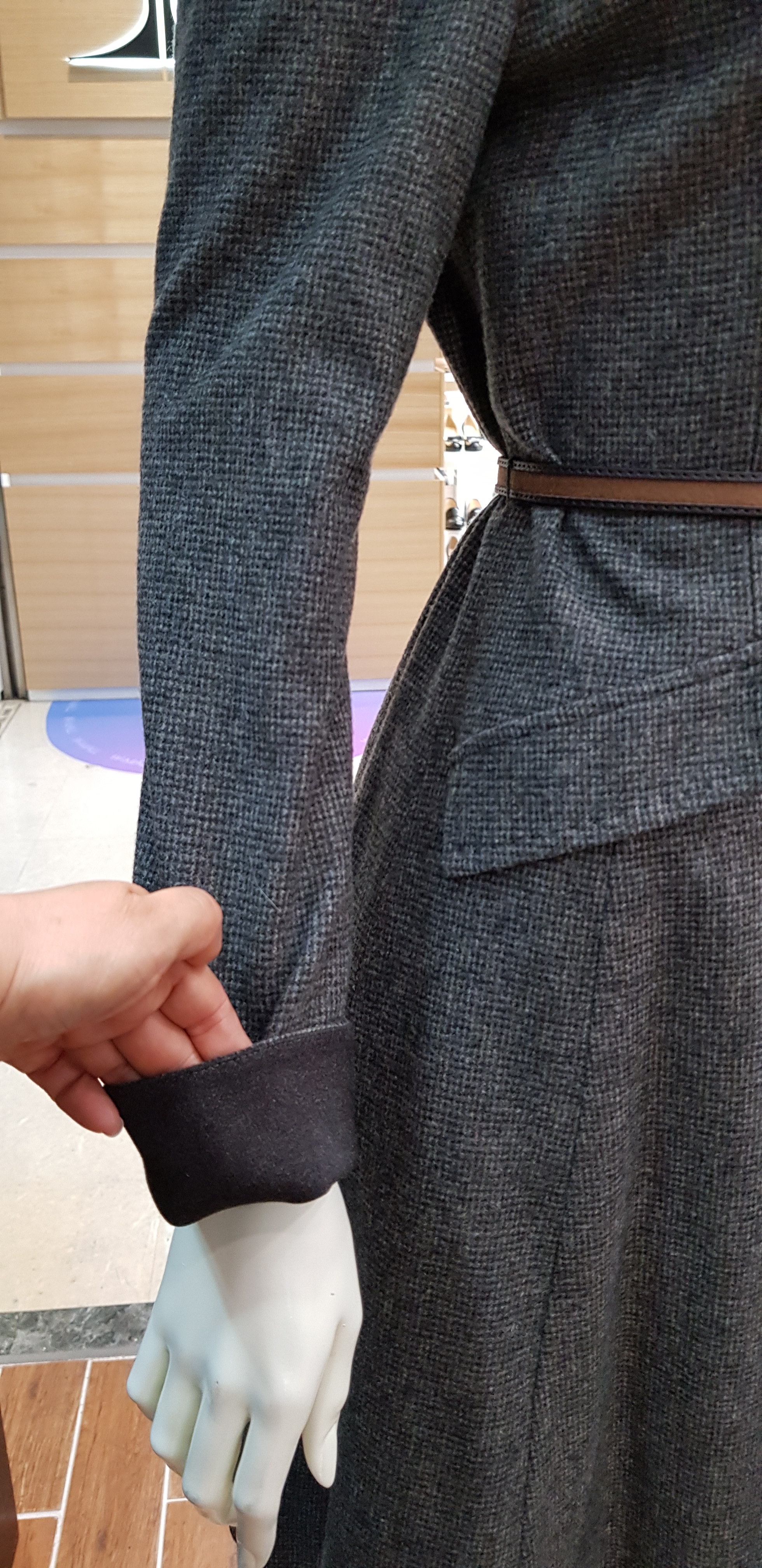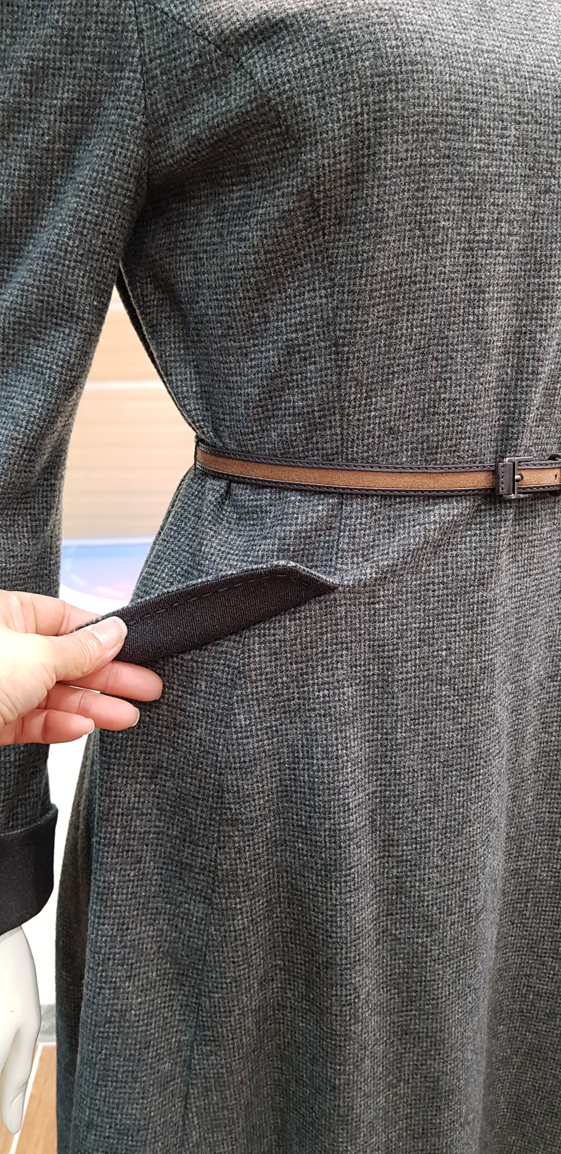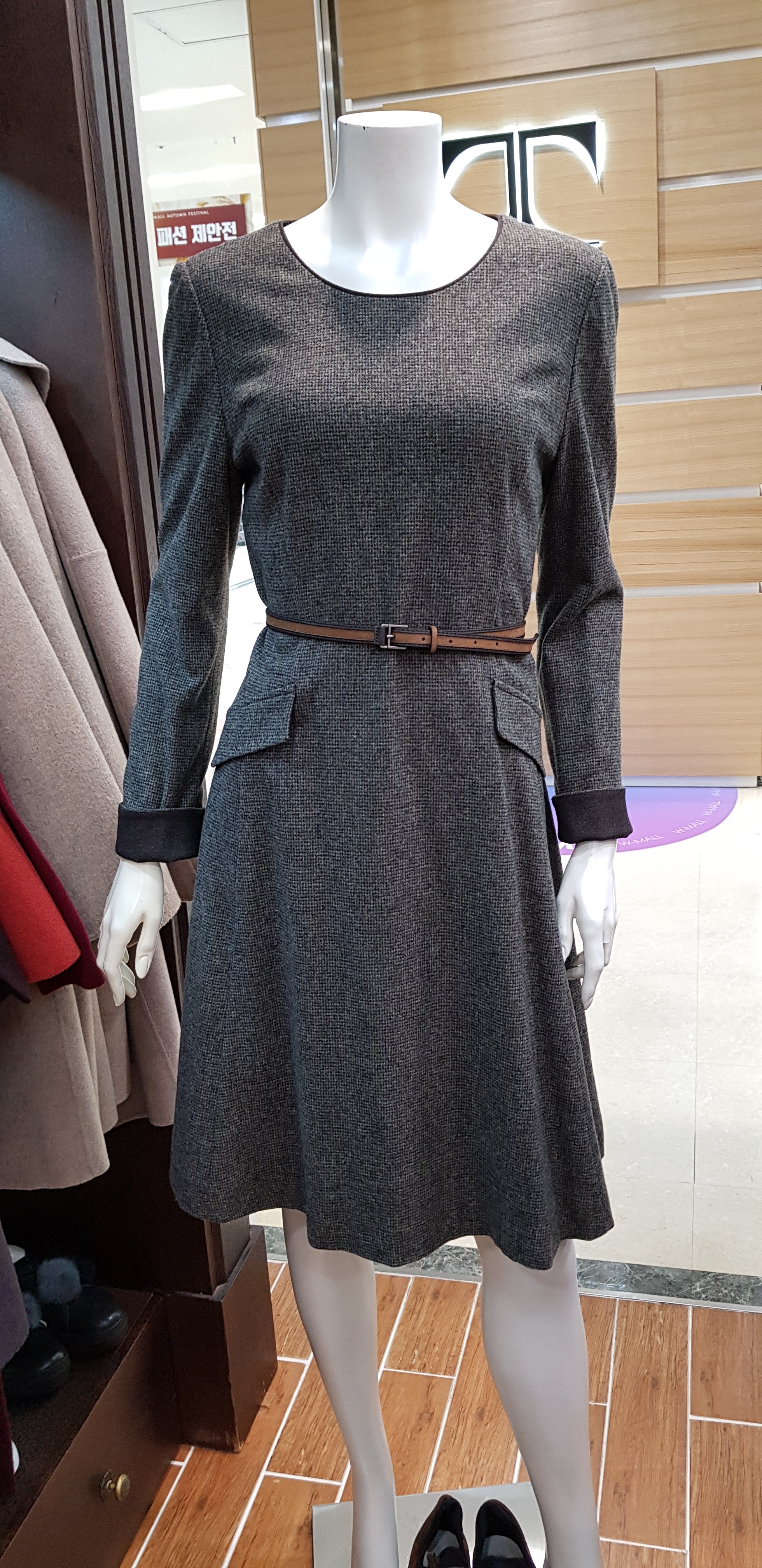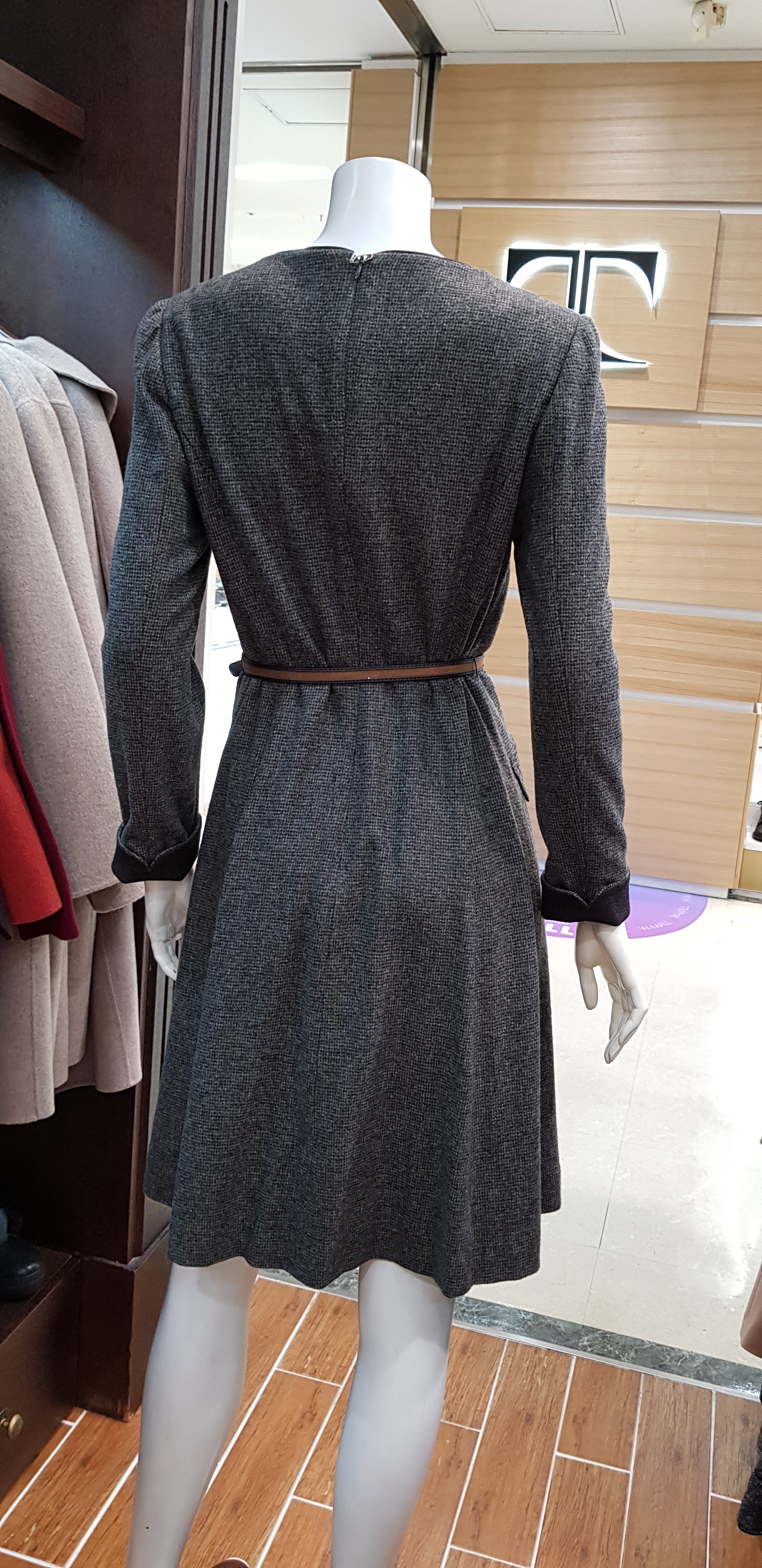 키이스~라운드넥의 에이라인 원피스입니다 슬림한핏이 여성스럽고 잔잔한 체크가 고급스러워 정중한 분위기이며 코트나 재킷속에 활용할수있는 아이템입니다 총장93센티입니다