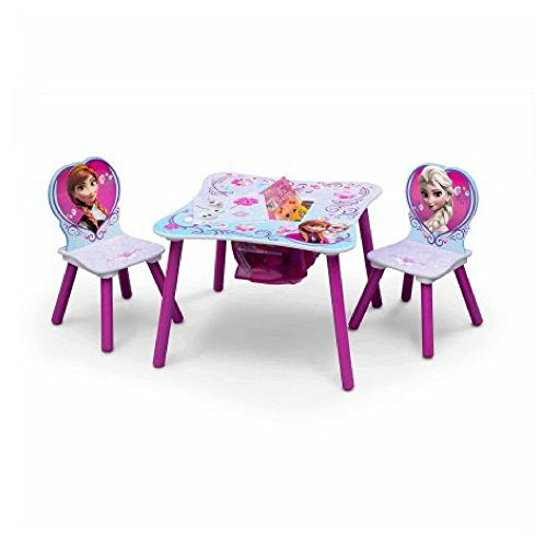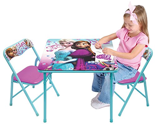 Now your child can play with her favorite characters, Anna and Elsa with the Frozen Activity Table Set. The Set comes with 1 table & 2 chairs. Bright colorful graphics & large table surface for drawing, eating & playing. Vinyl surface is washable. Made of sturdy metal tubular construction. Adult assembly required, tool included. Chairs include a Safety Locking Mechanism. Chairs have a recommended weight limit of 70 lbs. 24" x 24" Table with 2 Padded Chairs.Feature