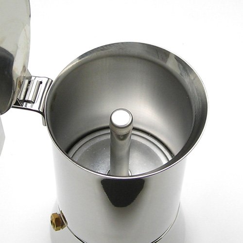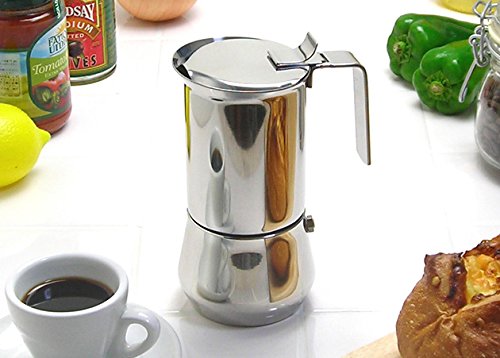 Make espresso like it's made in Europe, with this stovetop espresso maker. Stovetop espresso makers are popular because they are easy to use, less expensive than electric espresso machines, take up little kitchen space and … they make utterly fantastic espresso. That's why stovetop espresso machines have been well loved and well used all around the world. To use simply add water to the lower part of maker, add ground coffee beans to the basket and place unit on stovetop burner. And voile! fresh and tasty espresso for lattes, mochas, cappuccinos or drinking straight. This espresso maker is made of strong and long lasting stainless steel and has a four cup capacity.Feature