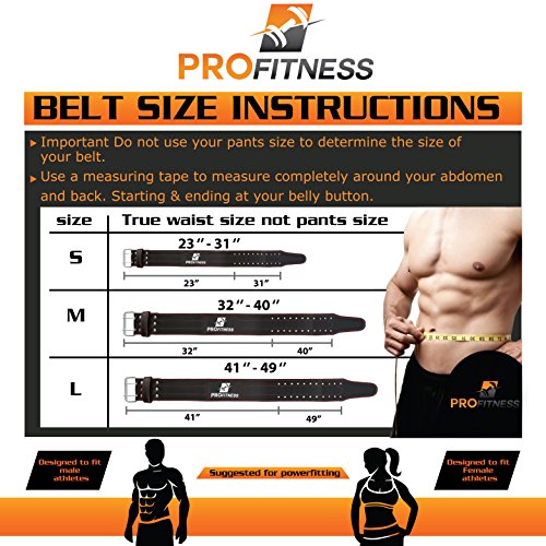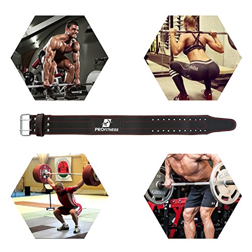 -. Feature : IMPROVED FORM & TECHNIQUE - Maintaining proper squat and lifting form is essential to not only strength gains, but for reducing injuries. This weightlifting belt helps ensure you sustain balance and stability throughout your sets. / PREVENT BACK INJURIES - Properly supporting your lower back (lumbar) is important, especially when lifting, twisting or supporting heavy weights. Our weightlifting belt is perfect for CrossFit exercises, powerlifting and daily fitness. / COMFORTABLE LEATHER - Each 4" wide genuine leather belt is comfortable, adjustable and won't slip or "ride" while you're performing squats, power cleans, dead lifts, or clean and jerks; just lift, gain and support your physicality. / BUILD CORE STRENGTH - Front to back, your core muscles play a major factor in your health and fitness. Our gym belt helps prevent back injury, but it also helps sustain strong abdominals and a thick back. / SATISFACTION GUARANTEED - ProFitness has worked hard to create the best workout belt made of genuine leather possible, however, if you don't love it, return it with 60 days for a full, money back refund.