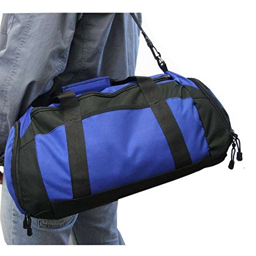-. Feature : Available colors: Black, Gold, Light blue, Hunter, Royal, Navy, Red, Maroon and Light pink / Material: 600-denier Polyester. Size: 10.75" x 20.75" x 9.5" / Front pocket and side zippered pocket / Wet pouch for pool or gym, Adjustable, detachable padded shoulder strap / Approx. 2,119 cubic inches