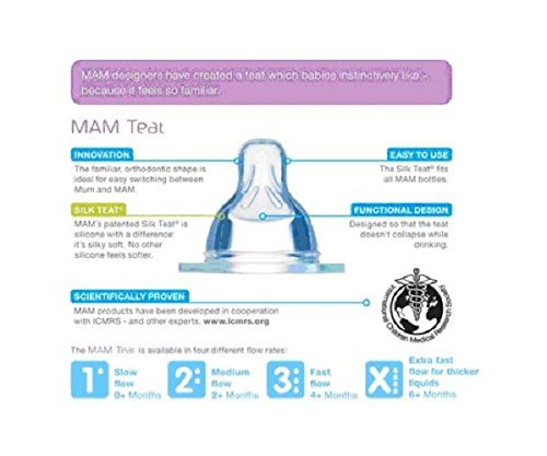 -. Feature : Pack of two wide neck silicone teats / Encourages natural suckling action / Silky soft textured surface / Fit all MAM bottles / Fast flow