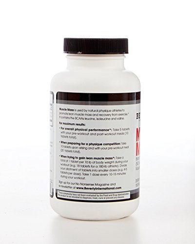 Why take BCAAs? The levels of the BCAAs leucine, isoleucine and valine in your blood fluctuate constantly. When they drop (especially in between meals), it can slow down muscle growth and recovery. • Taking Muscle Mass in between meals is an easy way to keep your BCAA levels higher and maximize lean muscle size and recovery.* • Who is Muscle Mass ideal for? It’s perfect for hard-training natural physique athletes and anyone else who is trying to gain lean muscle size or boost recovery. * • Muscle Mass is also great for anyone who eats little or no animal protein and wants to be sure they are getting enough BCAAs to preserve or build lean muscle and optimize recovery.* • Secrets to Success: For maximum results, follow the dosing instructions provided below. • For maximum lean muscle size*: Take a total of 1 tablet per 10 pounds of body weight during your workout (e.g. 18 tablets for a 180-lb athlete). Divide your allotment of tablets into smaller doses (e.g. 4-6 tablets each). Take 1 dose every 10-15 minutes during your workout. • For greater muscle recovery and performance*: Take 5 tablets pre-workout and again post-workout. • To preserve lean muscle during pre-contest dieting*: Take 10 tablets upon arising in the morning and again pre-workout. • For dramatic increases in muscle size, fullness and performance, take Muscle Mass with Mass Amino Acids and Ultra 40.* (Works awesome for hard gainers.) • To maximize lean gains and enhance recovery, always take at least 1 serving of a Beverly protein powder (Muscle Provider, Provosyn or UMP) right after each workout.* *These statements have not been evaluated by the FDA. This product is not intended to diagnose, treat, cure or prevent any disease.