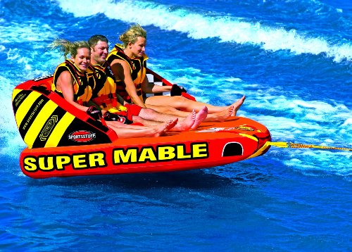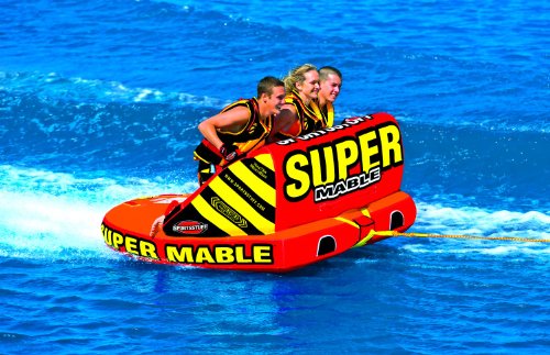 The new and improved classic SUPER MABLE towable will continue to impress you with a variety of different riding options. Featuring dual tow points, you can go for a wild ride utilizing the comfy backrest or tow them the opposite direction for a chariot style blast you'll never forget. All three sizes come equipped with comfy EVA foam seating pads. A multitude of double webbing foam handles with knuckle guards enable lots of different riding positions. The addition of air cushioned side walls will keep you on board while the redesigned backrest and new custom graphics make this uniquely shaped towable dressed to impress. The patented Speed Safety Valve and aluminum Quick Connect tow point will save you time. The SUPER MABLE features a heavy-duty K80 PVC bladder and double stitched full nylon cover with self bailing drain vents. They also make the perfect deluxe lounge at any pool, beach, lake, or river. 1-3 rider, 79 in. x 78 in. (deflated) 75 in. x 73 in. (inflated). Limited 1 Year Warranty.Feature