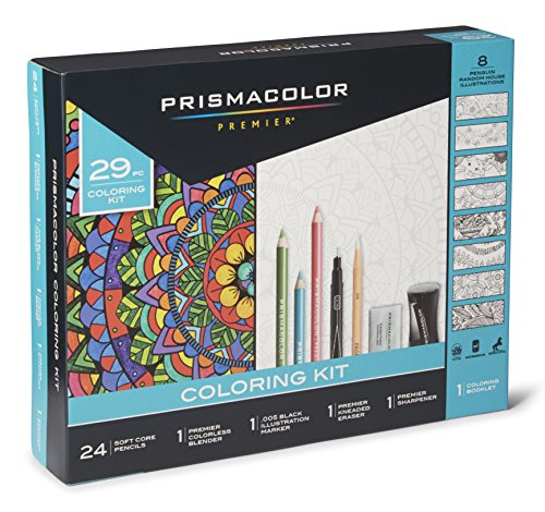 Prismacolor 1978739 Premier Pencils Adult Coloring Kit with Blender, Art Marker, Eraser, Sharpener & Booklet, 29 Piece