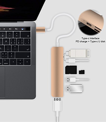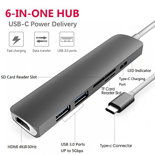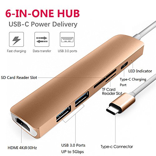 -. Feature : [6-IN-1 USB C Hub] HOGORE USB C dongle turns a single USB Type-C port into six interfaces includeing one 4K HDMI port, two USB 3.0 Type-A ports, SD & TF(Micro SD) card reader slots and a Type-C charging port. Does not require any software, drivers or complicated installation process. Bring back all the ports of your Macbook Pro / [4K HDMI Video Output] Mirror or extend your screen with the HDMI port and directly stream 4K UHD or Full HD 1080p video to HDTV, monitors, or projectors, supporting resolution up to 4K@30Hz and 1080@60Hz.Downward compatible 2K/1080p/720p/480p/360p/ resolutions / [Pass-through Charging] With a Type-C Power Delivery port, HOGORE USB-C Hub can charge your Laptop and other Type-C devices while connecting multiple peripherals or transferring data. Also, both of the USB 3.0 ports can power connected deviese with a 0.5A/2V Current / [Sleek & Ccompact Design] The aluminum alloy construction is design to echo Macbook and Macbook Pro series. Color available in space gray, silver, gold and rose gold / [One Year Warranty] You also get the 30-day money-back guarantee for any reason and a one-year warranty for quality-related issues. Contact us via amazon email for customer service.