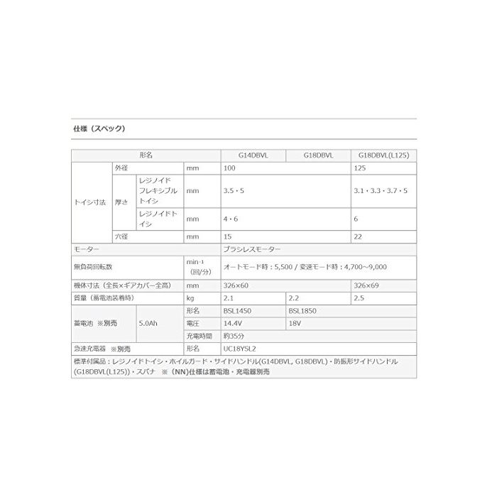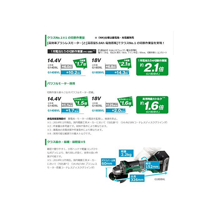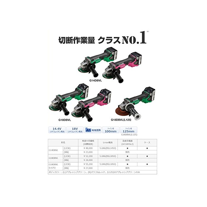 원본상품명:日立工機 18V コドレスディスクグラインダ 充電式 砥石φ125mm 蓄電池充電器別り G18DBVL(NN) 本のみ