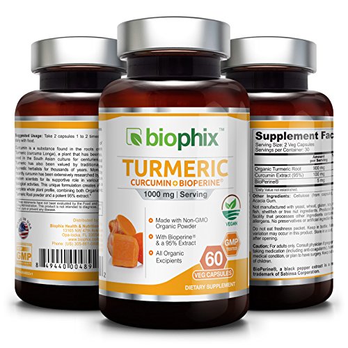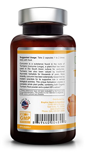 Studio : Biophix Publisher : Biophix Binding : Health and Beauty Product Description Curcumin is a substance found in the roots of Turmeric (curcuma Longa), a plant that has been used in the south Asia culture for centuries. Turmeric has also been valued by traditional Ayuvedic herbalist for thousands of years. More recently, curcumin has been extensively researched by modern scientist for its supportive role in various biological activities. This unique formulation creates a complete whole plant profile, combining both Organic Turmeric Root powder and a potent 95% extract.* Made in the USA. Biophix is FDA and cGMP Certified. Pure and Organic. 0