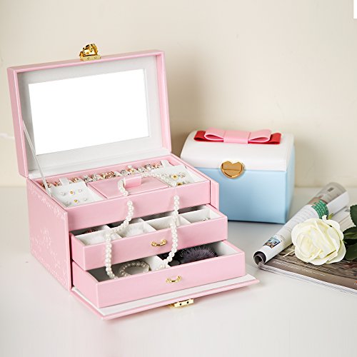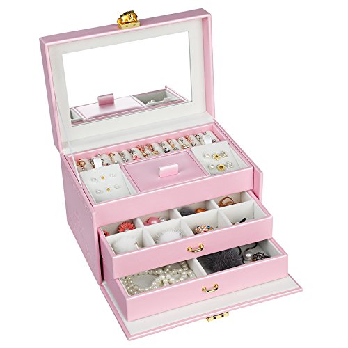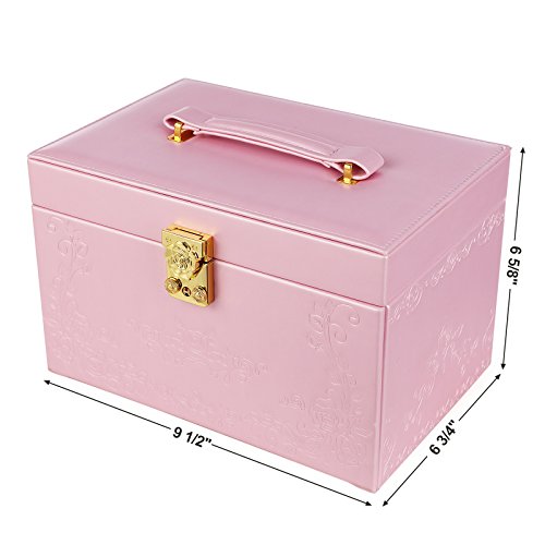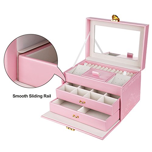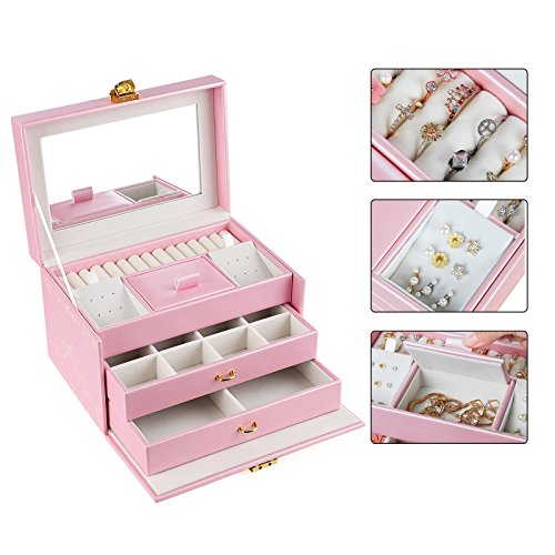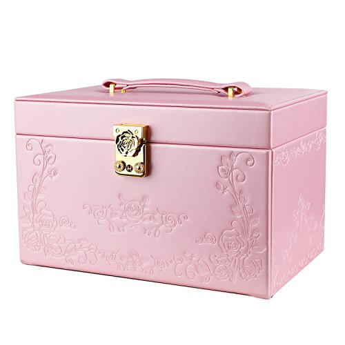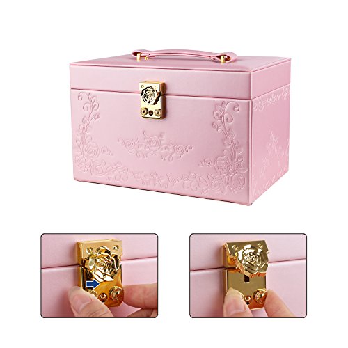 -. Feature : FANTASTIC LOOK: Pink exterior and white plush lining blend nicely; embossed rose decoration enables it to stand out easily wherever you go, making it a great gift for girls or women / FLOWER-SHAPE LOCK: Flower-shape closure adds elegance to the jewelry holder; the lock with 2 keys keeps your valuables safely organized and out of reach for kids / CONVENIENT DESIGN: Built-in mirror for jewelry wearing or making up anytime you need; grab-and-go handle for easy carrying; delicate ribbon prevents the lid from leaning back / HASSLE FREE STORAGE: 3-tier 18 compartments help organize all your jewelries in one place, versatile sections give you ample storage options for earrings, rings, bracelets and necklaces, etc / BOTTOM PAD: Specially designed hard faux leather bottom pad, wear-resistant and anti-slipping, protect your jewelry organizer from scratches