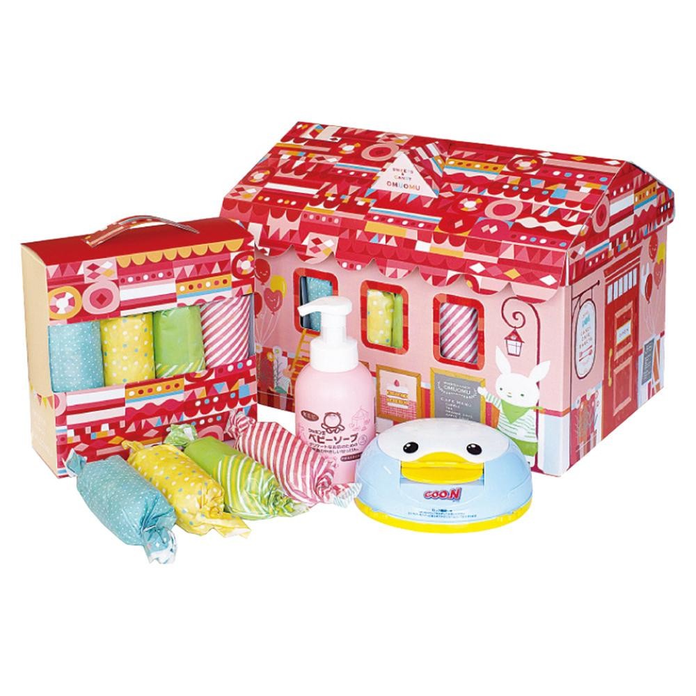 | おむつやおしりふきシート、ベビーソープがかわいいBOXに入っています。おうちをモチーフにした女の子向けデザイン♪ |
