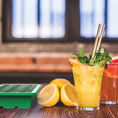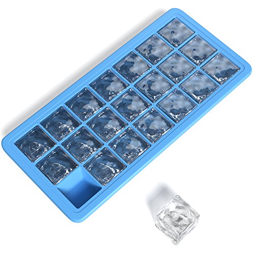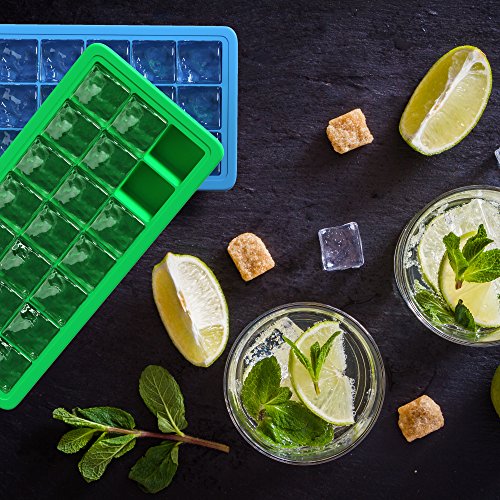 - FLEXIBLE ICE TRAYS FOR FREEZER - Covered ice trays 2 pack for drinks with 21 small cubes per tray and 42 total cube count quantity; each cube measures 1.3 inch square with 1 tablespoon volume capacity, and fits nicely in a medium to wide mouth water bottle or thermos. Cool colored kit comes with 1 blue ice tray, 1 green ice tray, and 2 clear lids