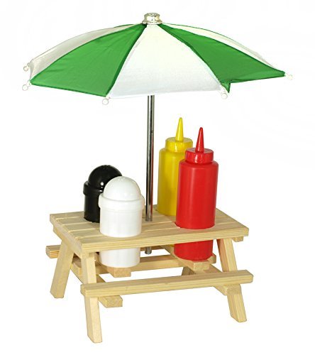 -. Title : CONDIMENT HOLDER PICNIC BENCH UMBRELLA SET SALT PEPPER SAUCES WOODEN OUTDOOR NEW
