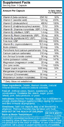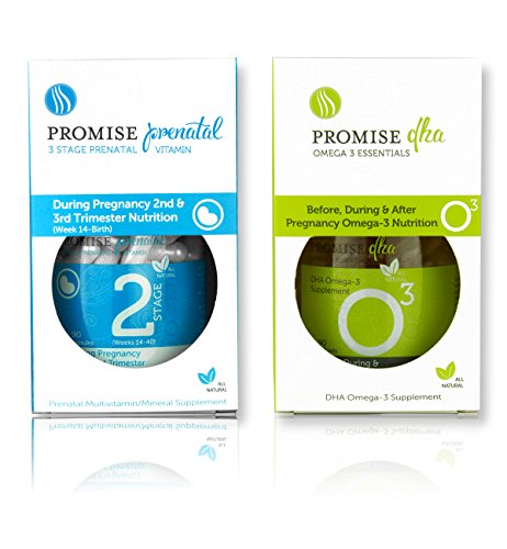 Promise Prenatal Stage Two + DHA- is the only prenatal vitamin uniquely formulated to meet your specific nutritional needs during your second and third trimester while Promise DHA provides the recommended amount of DHA. This complete prenatal vitamin contains all natural ingredients and contributes greater amounts of iron, vitamin C, calcium and magnesium you and your baby need during this period of extraordinary growth. Only one small capsule daily provides 21 essential vitamins and minerals and one softgel daily provides 275mg of pure DHA.Feature