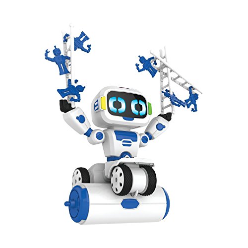 Pack of two (2) Color: White/Blue Playful robot friend who loves to play with you, be silly, move around, spin, and most of all... tip! Easy remote control with 5 play modes Motions via single motor Can move forward, backwards, spin Mode indicator switch/slider on right ear 2 wheels in front, 2 wheels in back Knows when there is something on his right or left hand, and leans to side accordingly Can stack on his head, but he won't recognize it When on cylinder, re-balances himself front to back Has hinge in waist_ parent/child can enable or disable it for easy/harder play Eyes animate via LED display Built-in speaker Play button: Additional button on left ear for starting games Comes with remote control and RoboBarrel cylinder that holds 4 ladders and 6 robots