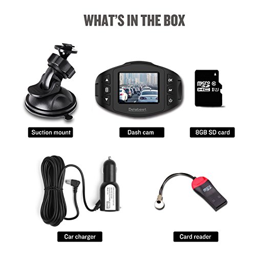 - WHAT YOU GET: Purchasing this car camera, you can get a FREE 8GB microSD card, a FREE card reader, suction mount, car charger, cleaning cloths and a user manual. Delabest provides 12-month warranty, quick response, friendly and professional customer service.