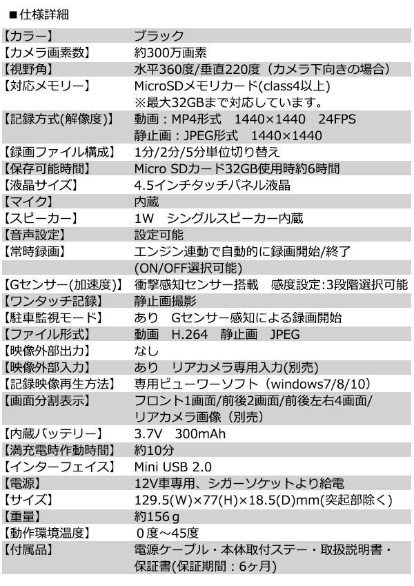 | フロントガラスに取り付けるだけで360度、全方位を隙なく撮影できます。動画撮影はFHD画質(約200万画素)で鮮明に撮影され、4.5インチの液晶タッチパネルを備えているので録画した映像もその場で確認できます。エンジンを停止して本機の電源がOFFになった後も、衝撃を検知すると検知後の映像を録画することができ、車上荒らしや駐車中の当て逃げなどもしっかり録画できます。 |
