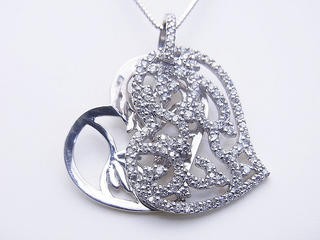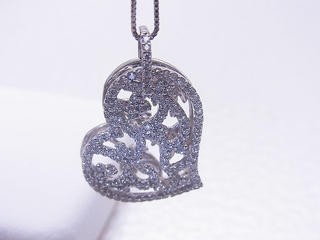 ペンダントトップの大きさ トップ:表側メレダイヤ付ハート縦横:約2.5センチ 裏の葉モチーフハート 縦横2.3センチ 厚さ2枚で2-3.5ミリ トップのみ取り外し可能