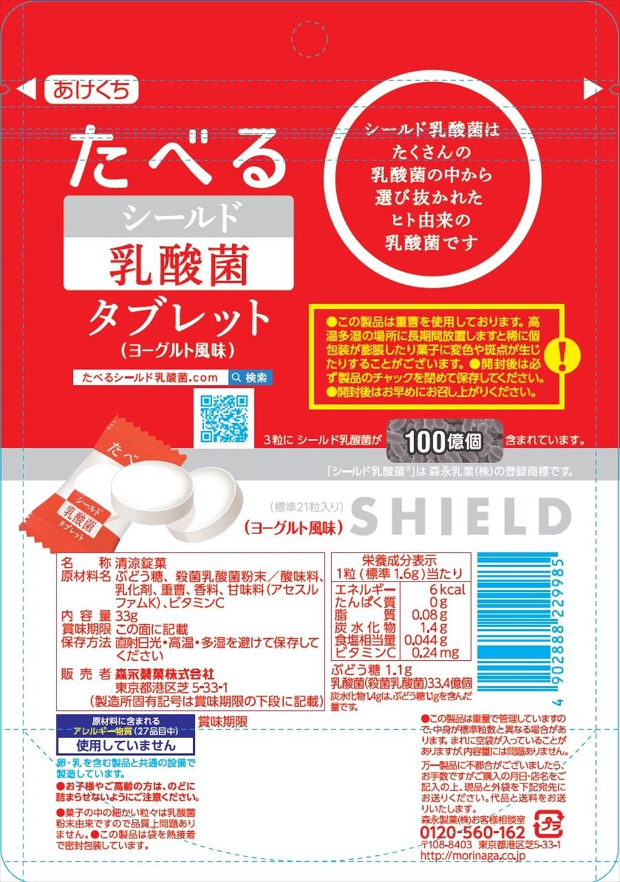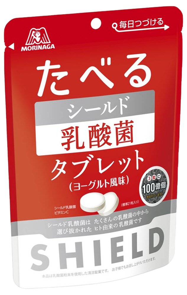 ●風邪予防や体調管理など免疫向上の効果が期待できる「シールド乳酸菌」を配合した錠菓●シールド乳酸菌を配合したヨーグルト風味の錠菓(3粒で1日の必要量100億個摂取)●ぶどう糖、ビタミンC、炭酸水素Na配合で、健康維持の効果が期待できる●いつでもどこでも手軽に乳酸が摂取できる便利な個包装タイプ