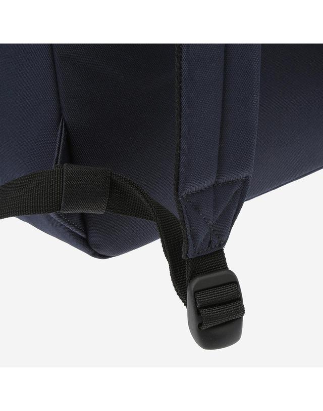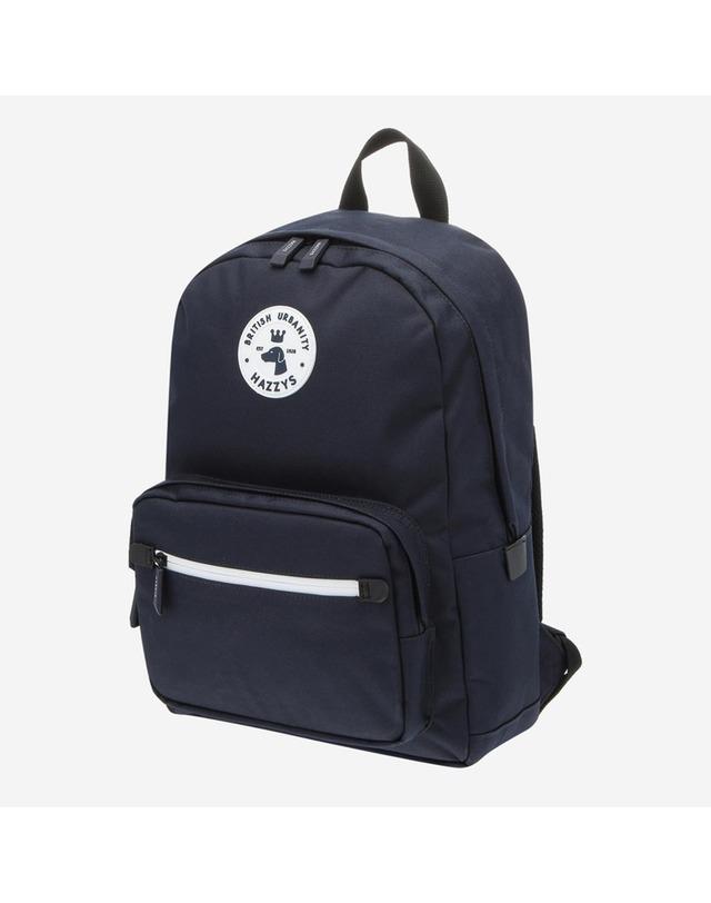 네이비 컬러의 라운드 배색 패치와 앞 지퍼 장식이 포인트인 백팩입니다.