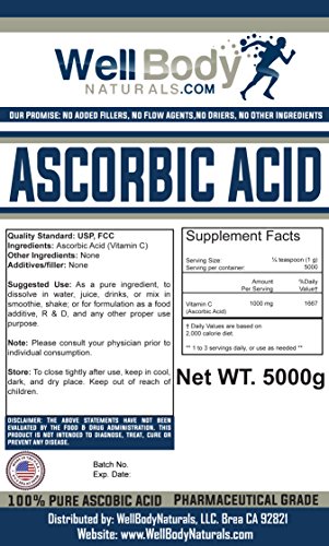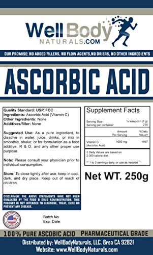-. Binding : Health and Beauty -. Brand : Well Body Naturals -. Feature : Clean & Pure Powder. No Fillers. / Factory Sealed Foil Zip Pouch. / Lab Tested for Verification & Guaranteed Purity. / USP (Pharmaceutical) Grade -. ProductGroup : Health and Beauty -. ProductTypeName : HEALTH_PERSONAL_CARE -. Title : WellBodyNaturals Pure Ascorbic Acid (Vitamin C) Powder