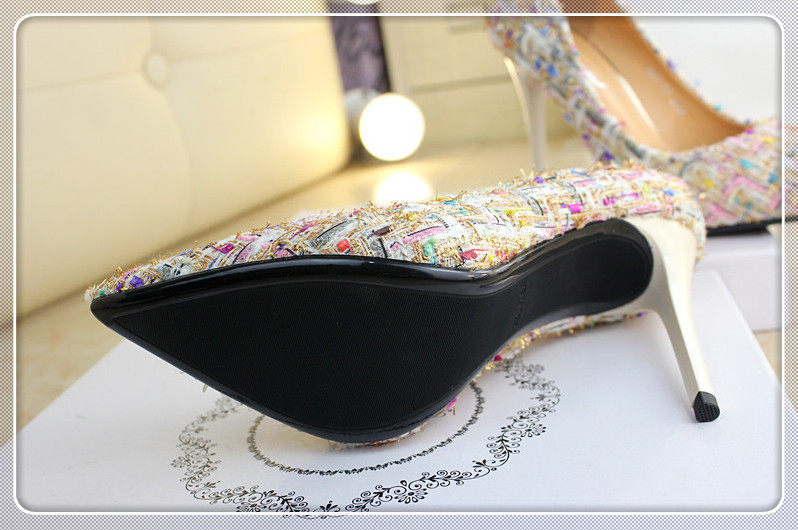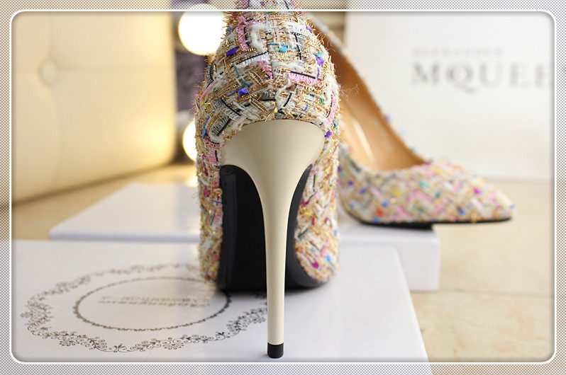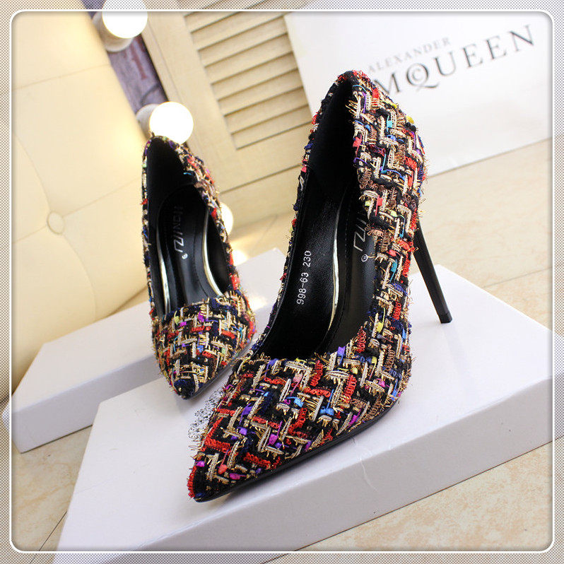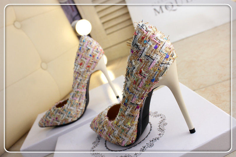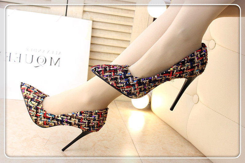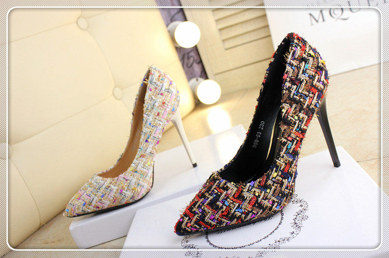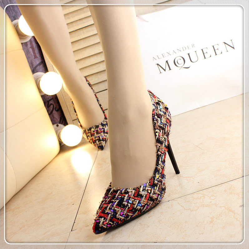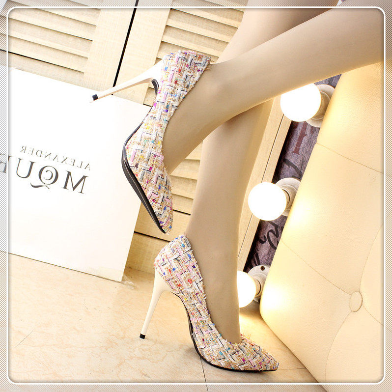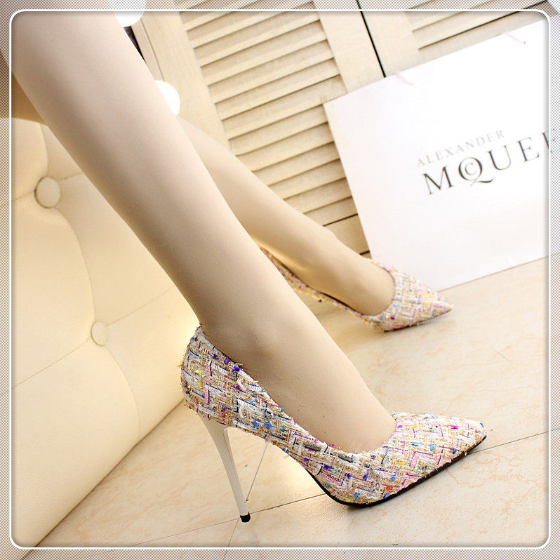 春季尖头小单鞋10cm细跟编织拼色时尚高跟鞋浅口女鞋韩版