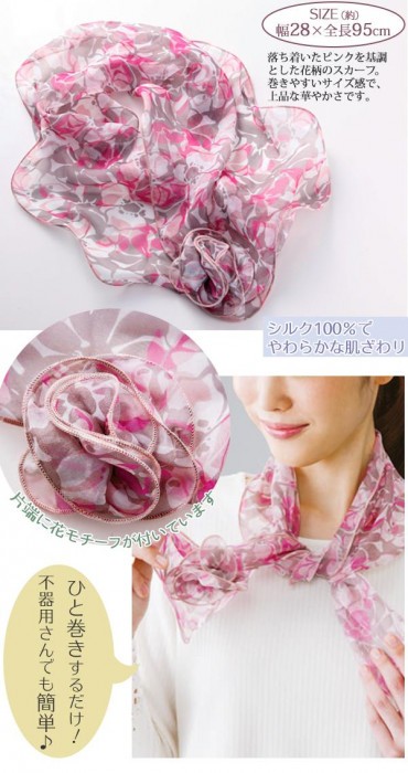 | 落ち着いたピンクを基調とした花柄のシルクスカーフです。片端に花モチーフが付いており、ひと結びするだけで首元を華やかに演出します。上品な華やかさで、普段使いはもちろんちょっとしたフォーマルにも。お洋服や気分に合わせて少し巻き方を変えれば、また違った装いになります。いつもの服装にプラスして、パッと華やかで女性らしい印象に。シルク100%でやわらかな肌ざわりです。 |