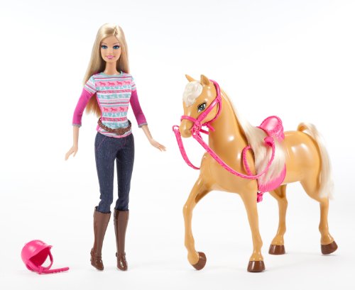 Always a horse lover, Barbie doll is a natural in the saddle and looks right at home upon Tawny, her beautiful, caramel-colored mare. The two best friends look great together with looks that complement each other. Barbie doll wears a shimmering, horse-themed top of blue, pink and white with shiny brown riding boots and a belt that match Tawny horse's beautiful brown hooves. A pink saddle, bridle and reins add Barbie signature style, while a bright pink riding helmet keeps this equestrienne safe. Girls will love horsing around with these two! Include Barbie doll and Tawny horse. Ages 3 and older.Feature