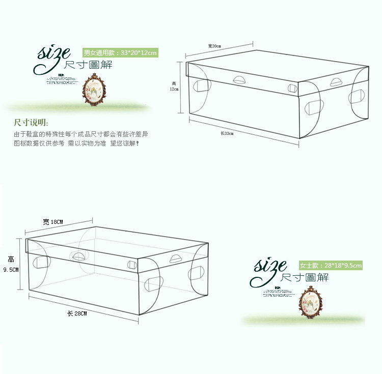Specifications: Ms. clamshell shoebox 27.5 * 18 * 9.5cm (for less than 38 yards of shoes) 60 g