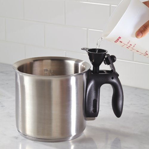 • The double boiler is designed with a water level indicator window on both sides of the handle and it even whistles when water needs refilling