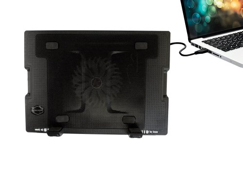 -. Feature : Large fan provides more air flow. / High thermal heat dissipation prevents overheating. / Great ergonomic shape for simple typing. / Support low noise. Adjustable any Angle. / Helps notebook to operate at full speed even while running high performance applications. / Lightweight and compact - Perfect for portable user. / Powered by 1 USB cable. / Plug-and-play: no drivers or software needed. / Rated Voltage: DC 5V. / Speed: 700-1400 RPM. / Noise Level: 15 dBA. / Fan Life Expectancy: 40.000 hours. / Bearing: r.i.f.l.e. / USB Port: 2. / Cable Length: 24 inches. / Dimensions: 14.5 x 10.5 x 1.3 - 2.3 inches.