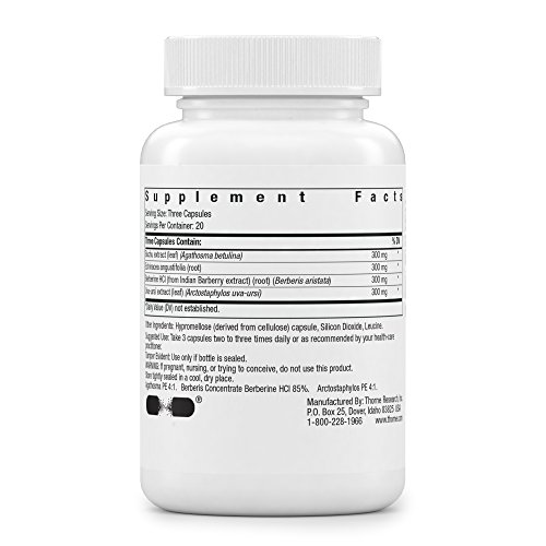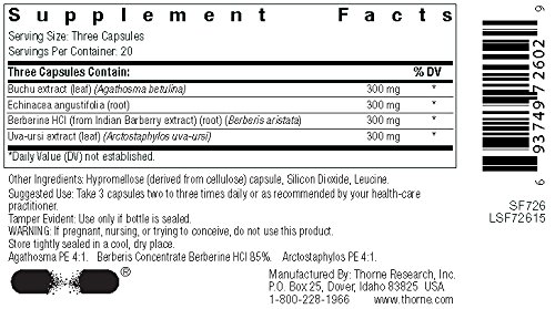-. Feature : Soothes irritated tissues in the bladder and other portions of the urinary tract, and helps maintain a healthy balance of microorganisms / Prevents attachment of unwanted bacteria to the walls of the bladder and urethra / Contains botanicals with a particular affinity for the urinary tract / Unique formulation offered only by Thorne Research / Does not contain dairy, soy, corn, egg, peanuts, yeast, sugar, magnesium stearate, binders, coatings, disintegrants, artificial colors, artificial flavors, or artificial sweeteners. Thorne Research, Inc. does not make any products that contain Genetically Modified Organisms (known as GMOs).