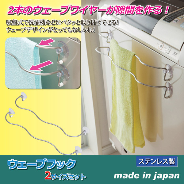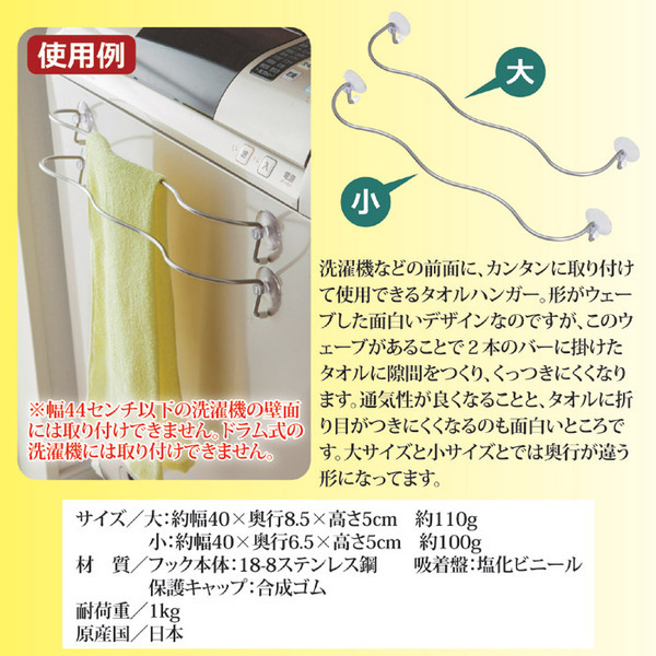 【商品名】 吸着盤式タオルハンガー/ウェーブフック 【大小2サイズセット】 ステンレス製 【ジャンル・特徴】 洗濯機等に取り付け可。通気性が良く折り目がつきにくいハンガー 洗濯機などの前面に、カンタンに取り付けて使用できるタオルハンガー。形がウェーブした面白いデザインなのですが、このウェーブがあることで2本のバーに掛けたタオルに隙間をつくり、くっつきにくくなります。通気性が良くなることと、タオルに折り目がつきにくくなるのも面白いところです。大サイズと小サイズとでは奥行が違う形になってます。■商品スペック【商品名】ウェーブフック 2サイズセット 【サイズ】大:約幅40×奥行8.5×高さ5cm小:約幅40×奥行6.5×高さ5cm 【重量】大:約110g小:約100g 【材質】フック本体:18-8ステンレス鋼吸着盤:塩化ビニール保護キャップ:合成ゴム 【付属品】 【生産国】日本 【特記事項】耐荷重:1kg 【注意事項】※幅44センチ以下の洗濯機の壁面には取り付けできません。ドラム式の洗濯機には取り付けできません。