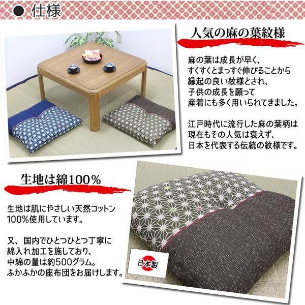 銘仙判サイズ(約55×59cm)の布団です。綿100%を使用した側地は洗濯機でも洗うことができお手入れも簡単です。国内綿入れ加工をしているためふっくらとしたほどよいクッション性があります。