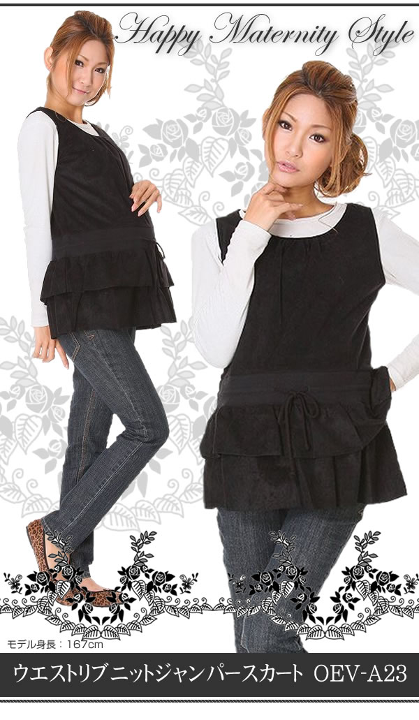 マタニティ期間をハッピーに過ごすキュートなジャンパースカート☆手触りのいいスエード調の生地で裾の2段フリルがポイント!お腹周りはゴムになっていて、締め付けないのがうれしい♪サイズ/M 日本製 ※サプライヤー直送品【商品名】ウエストリブニットジャンパースカート OEV-A23 01Mクロ