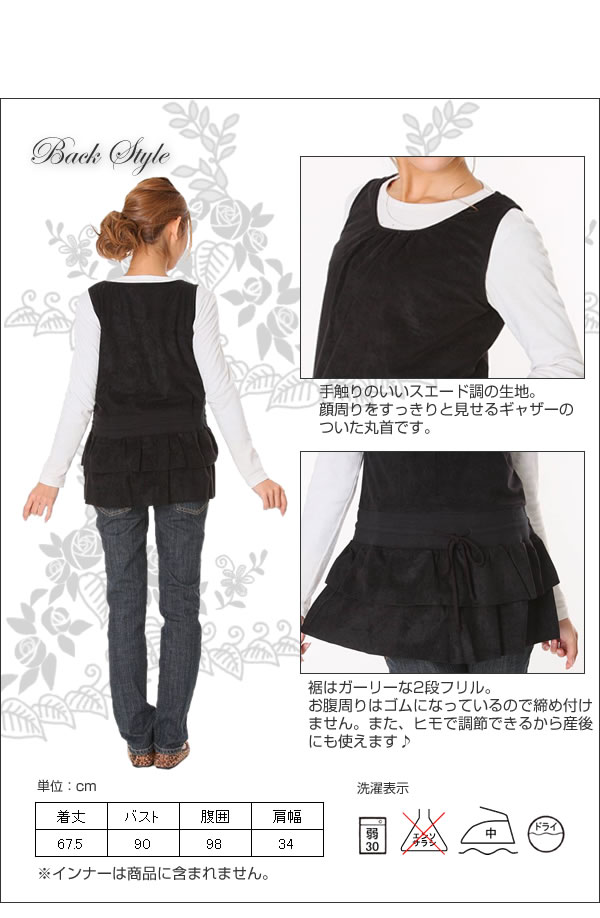マタニティ期間をハッピーに過ごすキュートなジャンパースカート☆手触りのいいスエード調の生地で裾の2段フリルがポイント!お腹周りはゴムになっていて、締め付けないのがうれしい♪