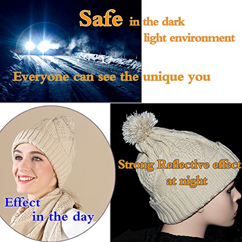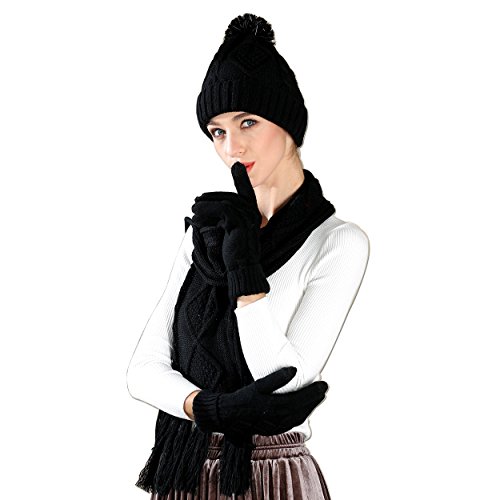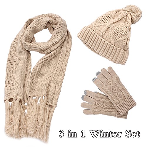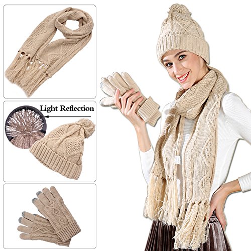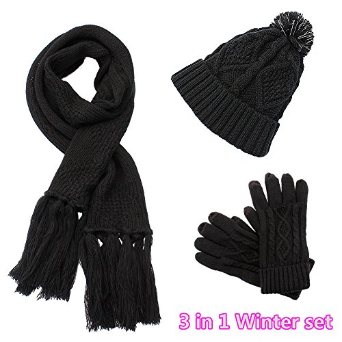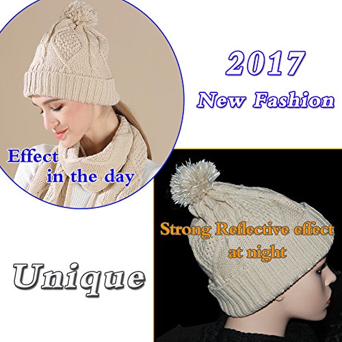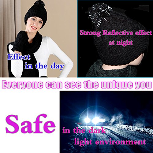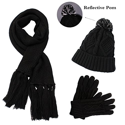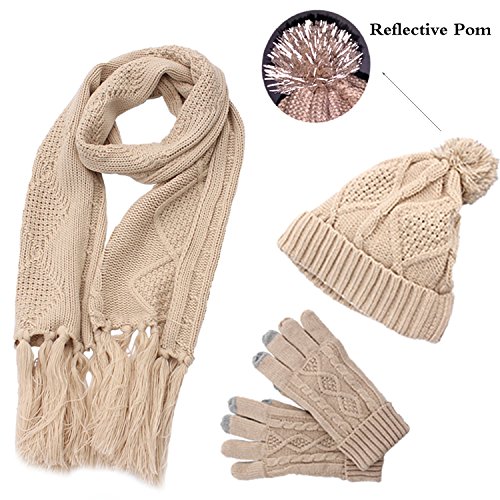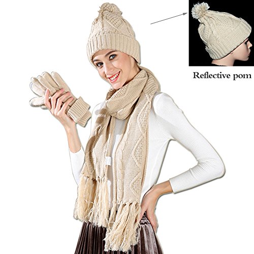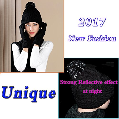 Binding : Apparel Product Description 2017 NEW FASHION 3 in 1 winter set includes a fashionable, matching knit hat, scarf, gloves that is perfect for guarding against the harsh cold seasons HIGH QUALITY FABRIC: 100% acrylic fabric, cozy and soft without any uncomfortable feeling. 2017 new design of the knitted hat is fashionable and unique. Unique visual impact, trendy fashion wear experience. The length of the cap can cover the ears, so that your head is always warm and comfortable. Fluffy POM POM design makes the hat look better,easily and conveniently matches any of your winter outfits. REFLECTIVE FILAMENT MATERIAL:High quality reflective silk material in pom pom is invisible in the day. when worn at night, reflective effect is strong. Unique and double protection travel safety.Trendy wearable experience,everyone can see the unique you at one glance in the dark light environment. FUNCTIONAL TOUCH SCREEN WARM GLOVES: Equipped with touch screen technology to enable smartphone and tablet use while keeping hands warm in the cold weather. The touch screen parts are on the first,second and third fingers of both gloves. Super Soft hand feeling scarf - warm and comfortable, easy to wear for a varied fashion style. Simple but classic style.A must fashion accessory in Winter for keeping warm. Scarf size: About 68.75 * 11.42 inch MATCH YOUR NEEDS: Classic fashion design, two colors to meet different needs, it can be selected to match your different clothes.Light weight makes you feel no sense of weight. Ideal for skiing,skating,jogging,travelling and other winter outdoor activities. People will love when they see you wearing this matching set! This product will make a great gift for your loved ones for any occasion! 0