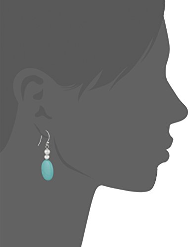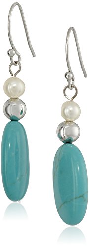Drop earring featuring simulated turquoise oval, sterling silver bead, and freshwater cultured pearl suspended from fishhook backing