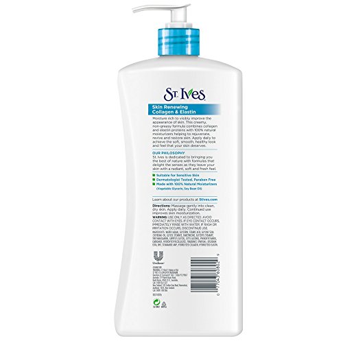 Enjoy the youthful radiance of revitalized skin with this St. Ives Renewing Collagen Elastin Lotion. Clinically proven to improve the healthy appearance of skin, this moisture-rich formula contains a combination of essential collagen & elastin proteins and helps revive and moisturize dry skin all day long. Apply daily to maintain hydrated skin that looks and feels soft, smooth and radiant.Feature
