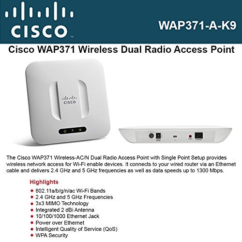 -. Binding : Electronics -. Brand : Cisco -. EAN : 0646672561250 -. Feature : The Cisco WAP371 Wireless-AC/N Dual Radio Access Point with Single Point Setup provides cost-effective 802.11ac wireless connectivity for improved mobility experience to your guests and employees. / Deliver high-speed wireless connectivity and guest access more securely and reliably in your small business. / The Cisco WAP371 Wireless-AC/N Dual Radio Access Point with Single Point Setup is a simple yet powerful, high-performance access point. / It offers business-class features such as Gigabit Ethernet connectivity, a captive portal for customized guest access, and robust security. / Provides 802.11ac wireless connectivity up to three times the 802.11n speed -. Label : CISCO SYSTEMS - ENTERPRISE -. Manufacturer : CISCO SYSTEMS - ENTERPRISE -. Model : WAP371-A-K9 -. MPN : WAP371-A-K9 -60 -. PackageQuantity : 1 -. PartNumber : WAP371-A-K9 -60 -. ProductGroup : PC Accessory -. ProductTypeName : MONITOR -. Publisher : CISCO SYSTEMS - ENTERPRISE -. Studio : CISCO SYSTEMS - ENTERPRISE -. Title : Cisco WAP371-A-K9 Small Business WAP371 - Wireless access point - 802.11a/b/g/n/ac - Dual Band -. UPC : 646672561250